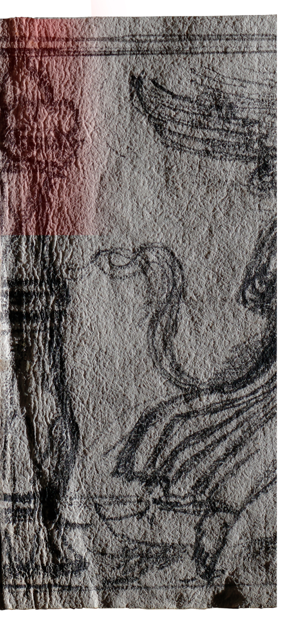 Als Trocknungsfalten bezeichnet man die Spur, die bei der Trocknung eines frisch geschöpften Papierbogens entsteht, der mittig aufgehängt wurde. Sie zeichnet sich im getrockneten Papier als runzlige Bahn ab (ein Teil ist im Streiflichtbbild rot markiert).
