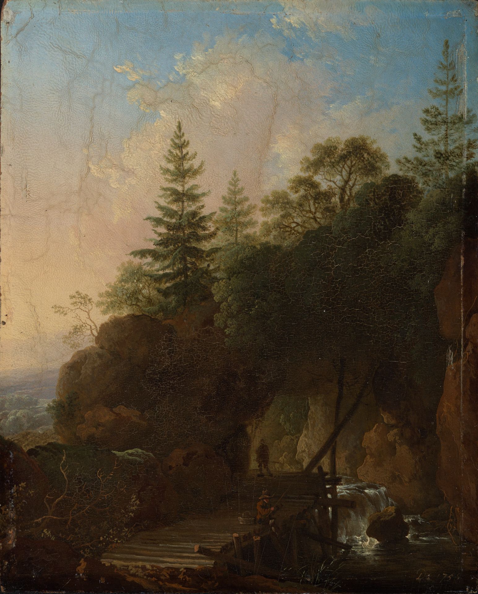 | Titel | Gebirgslandschaft mit Wasserfall und hölzerner Brücke |