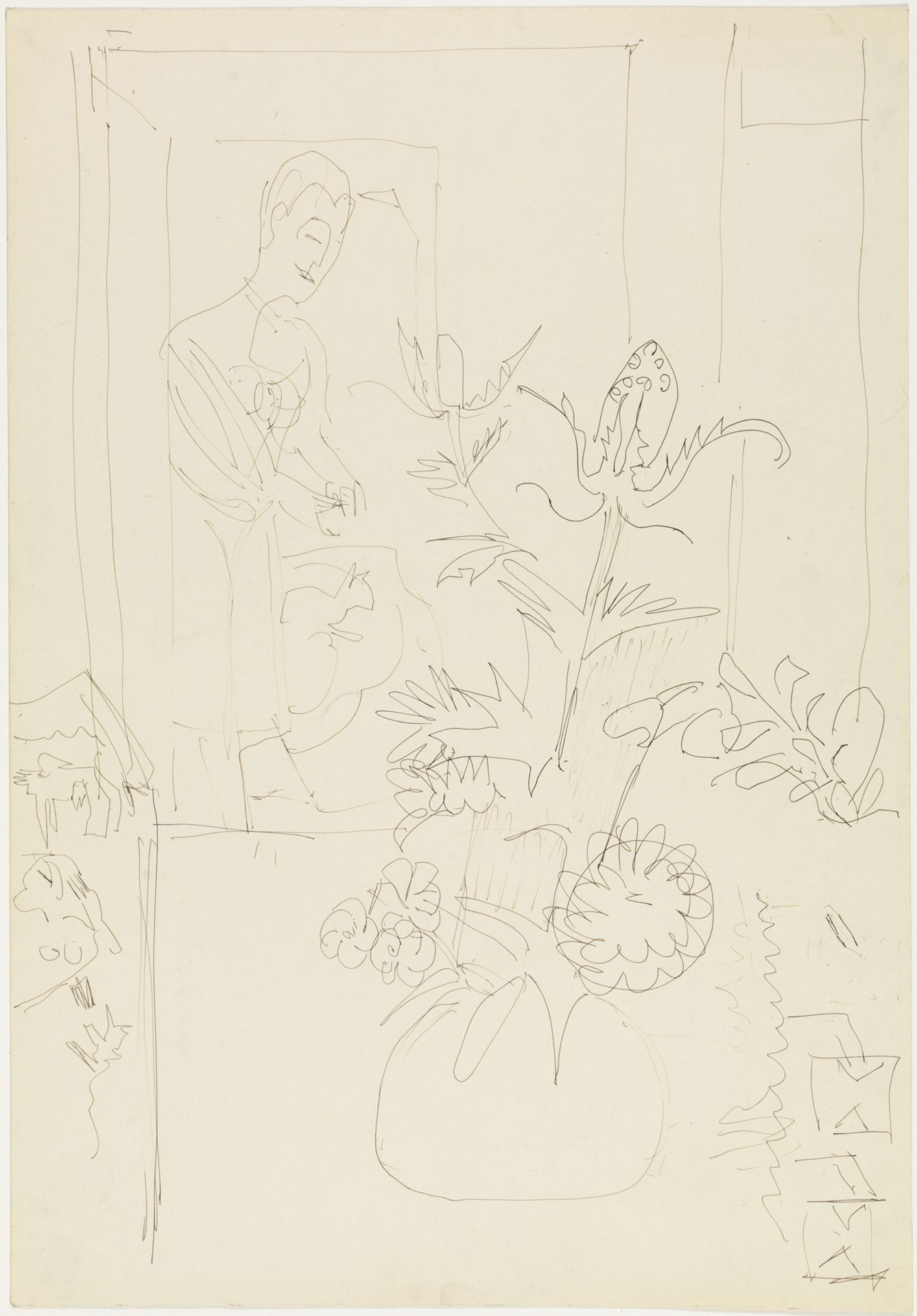 Interieur mit Blumenvase, Frau und Katze