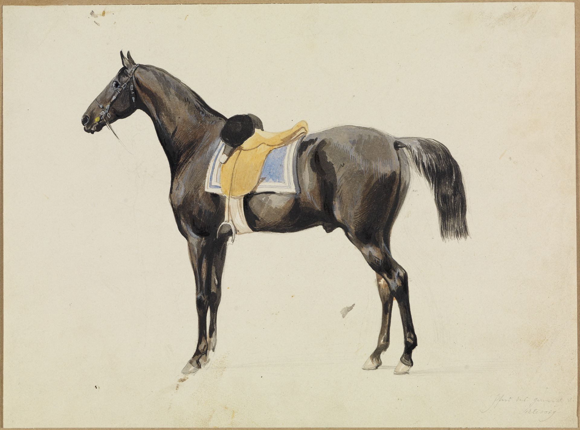 Gesattelter Rappe, im Profil nach links stehend ("Album von Studien [...] aus dem Schleswig-Holsteinischen Kriege (1848-1850), enthaltend circa 80 Blätter"; L: Blatt 88)