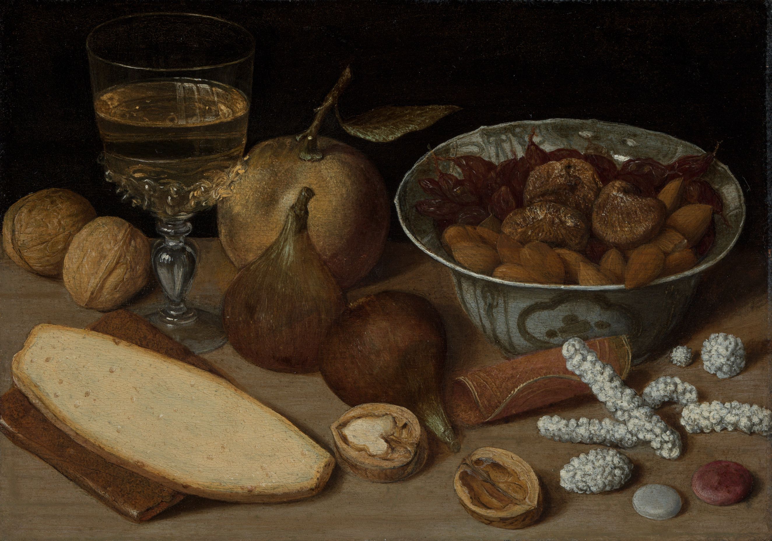 | Titel | Stillleben mit chinesischer Schale und Weinglas, Nüssen, Feigen, Zuckerwerk und Brot |
