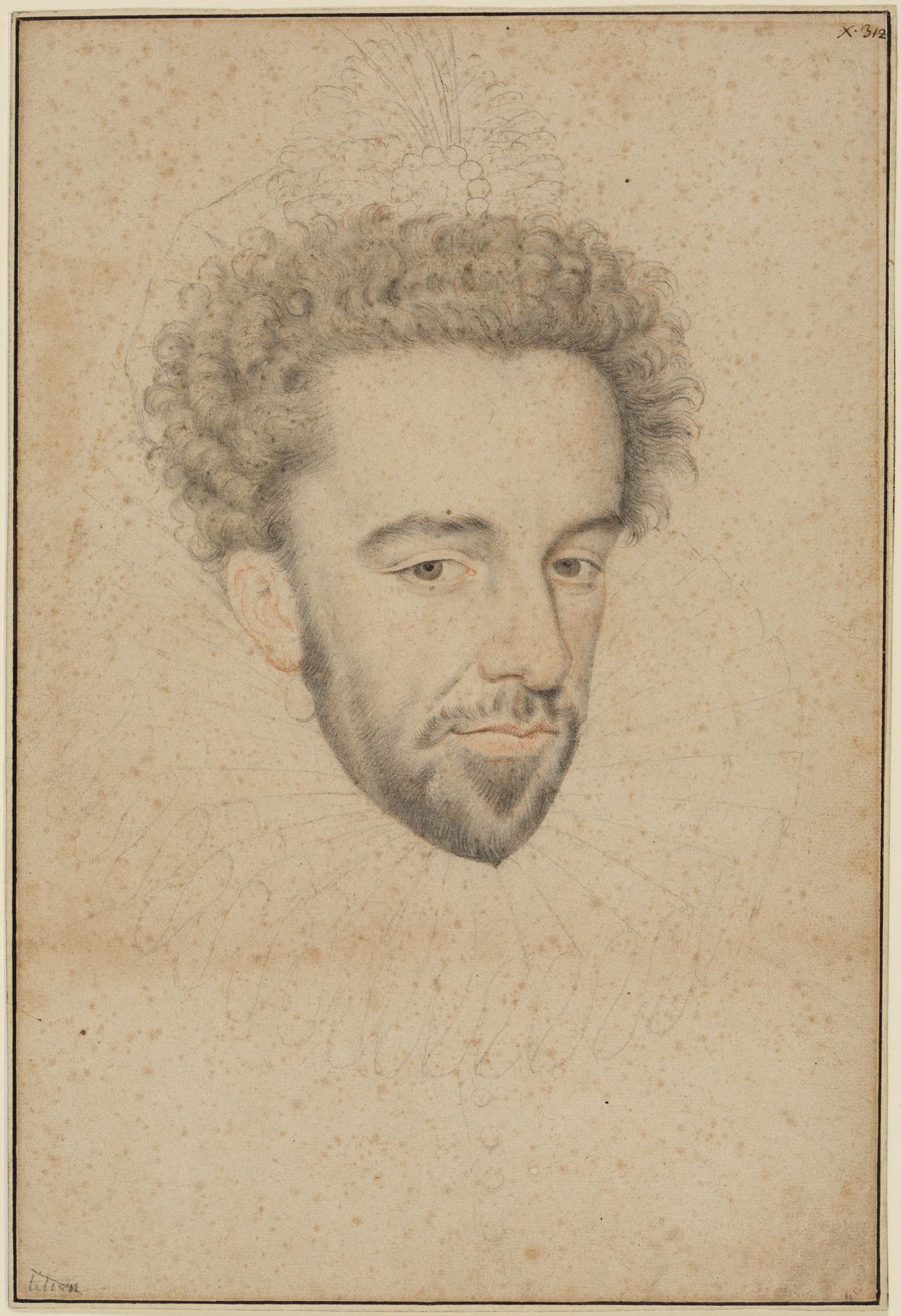 Zugleich spiegeln die Halskrause, die kostbare Agraffe auf dem Kopf, die große Perle am Ohr sowie das sorgfältig frisierte Haar seine überlieferte Vorliebe für aufwendige Kleidung und Schmuck. All diese Accessoires hinterfangen jedoch nur skizzenhaft das präzise wiedergegebene Gesicht, das durch den behutsamen Einsatz von roter Kreide lebendig wirkt.