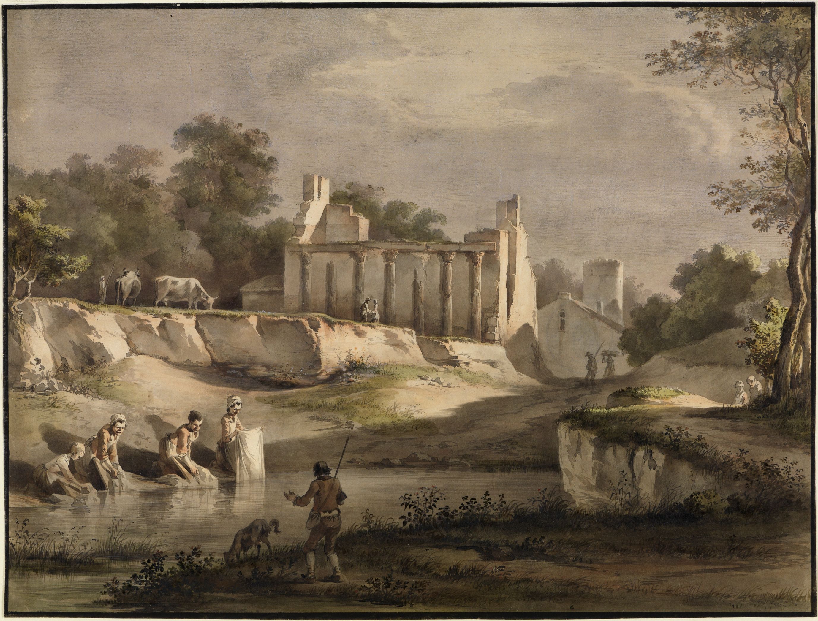 Eine Szene an einem Fluss: Ein Jäger grüßt die Wäscherinnen, die ihre Arbeit unter freiem Himmel verrichten. Auf einer Anhöhe weiden Kühe. Ein galantes Paar trifft sich, und Männer und Frauen gehen rund um eine antike Hausruine ihren Tätigkeiten nach. Anders als seine Zeitgenossen verwendet Jean-Jacques de Boissieu die Ruine nicht als melancholische Metapher der Vergänglichkeit, sondern als temporalen, fast schon romantischen Kontrapunkt in einer ländlichen Idylle. Das in zarten Tönen gehaltene Aquarell verlängert das Kalksteinplateau gleichsam organisch in die Architektur, so dass Ruine und Natur sich in dieser Landschaft harmonisch ergänzen.