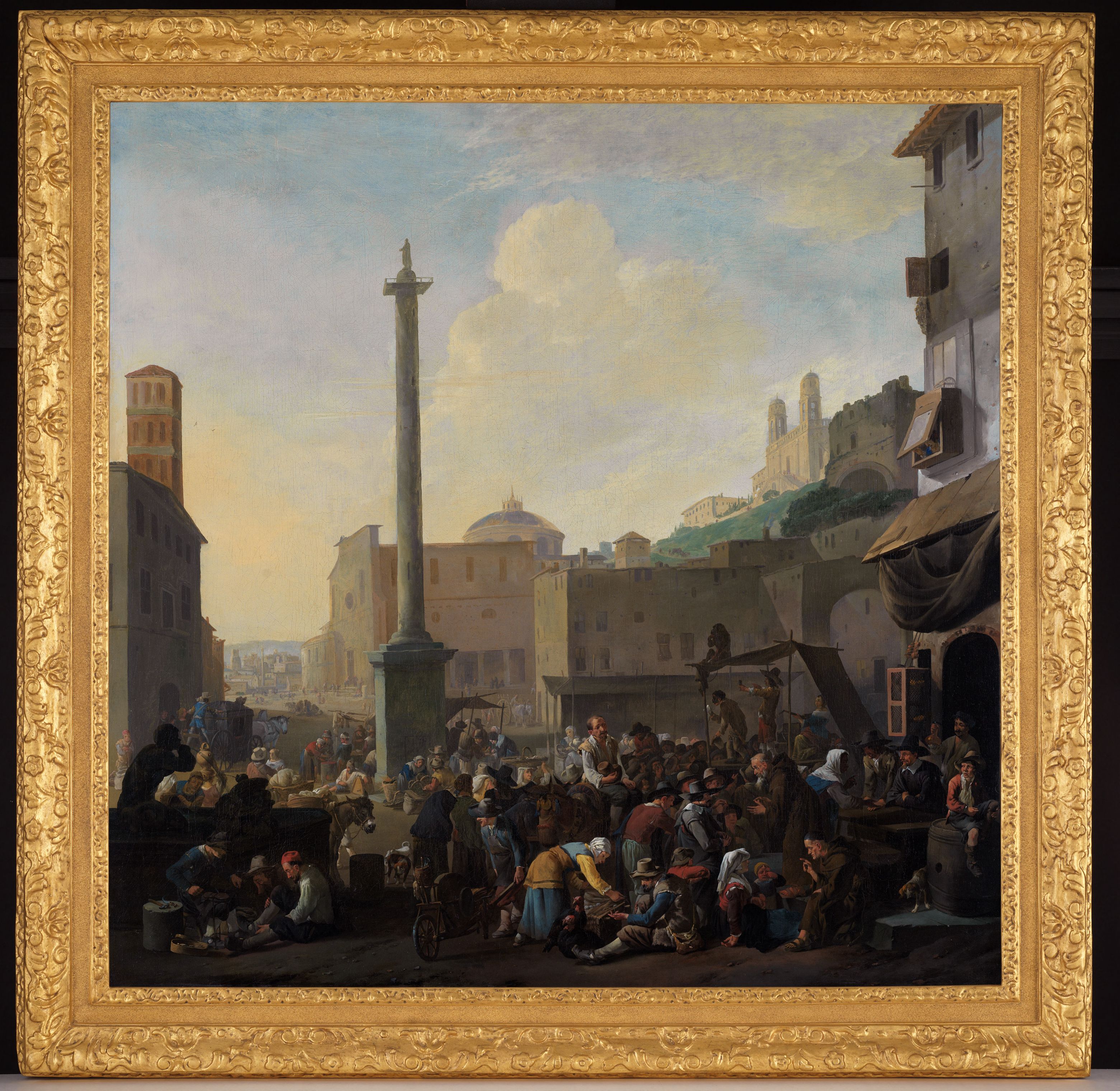 Lingelbach war nicht interessiert an der exakten Wiedergabe der römischen Architektur im Sinne einer Vedute, sondern vielmehr an der genrehaften Darstellung des Trubels in den Straßen Roms. Fässer und Karren sind auf der Piazza abgestellt und zu Tischen oder Sitzgelegenheit umfunktioniert. Einige Verkäufer haben ihre Zelte unmittelbar am Postament der Säule aufgebaut, während andere den Handel direkt am Boden abwickeln. Markisen, Vordächer und Pergolen sowie eine Durchmischung von Denkmälern der Renaissance und Antike kennzeichnen die Szene. Die Bauten bilden den offenen Bühnenraum, vor dem sich die Geschäfte und Interaktionen abspielen. Die freie Interpretation der Architektur lässt keine eindeutige Lokalisierung zu: So könnte die Marktszene auf der Piazza di Spagna stattfinden, wie es in der Literatur vorgeschlagen wurde. Wahrscheinlicher ist jedoch, dass sich das Geschehen auf der Piazza Colonna abspielt, in deren Mitte die römische Ehrensäule des Kaisers Marc Aurel steht. Von diesem Platz ist die Kirche Trinità dei Monti nur wenige hundert Meter entfernt. Sie lässt sich anhand ihrer Position und ihres Aussehens identifizieren, jedoch fehlt die berühmte Spanische Treppe, die erst in den Jahren zwischen 1721 und 1725 gebaut wurde.
