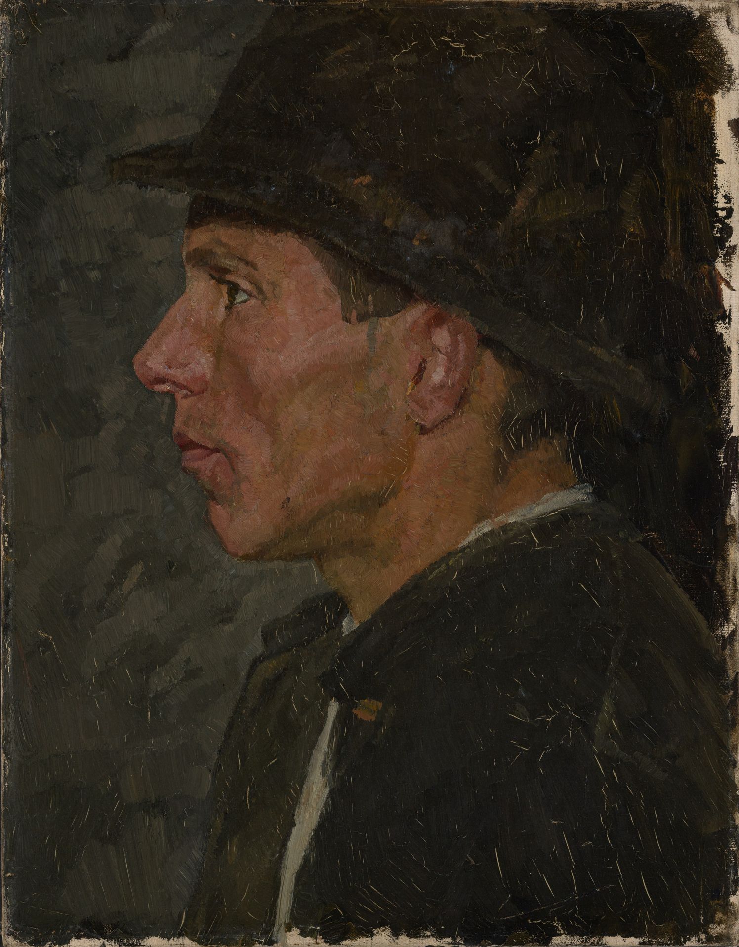 Kopf eines Bauern mit Hut im Profil