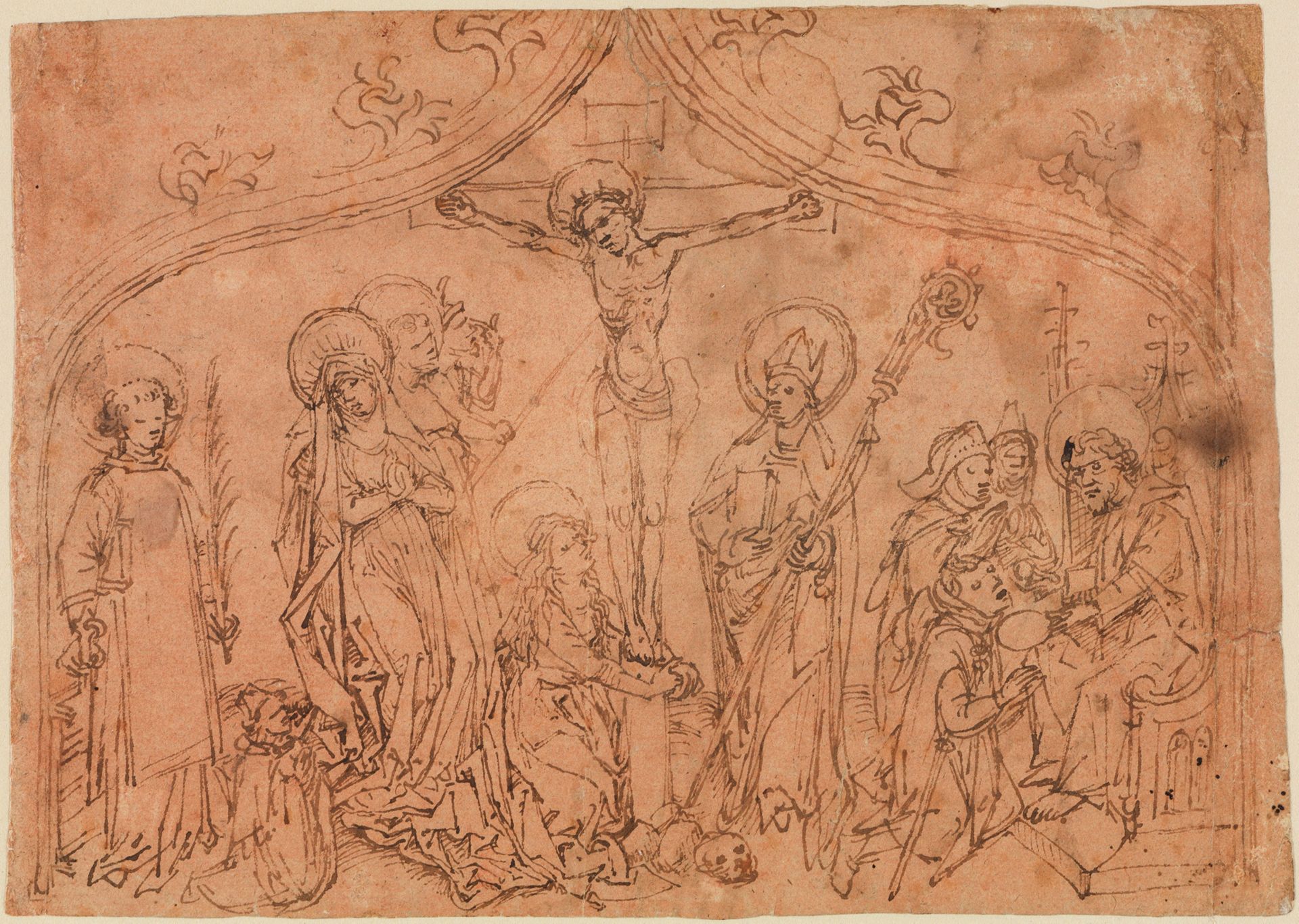 | Titel | Altarskizze (?) mit der Kreuzigung Christi, zwei Heiligen und Pilgerkommunion |