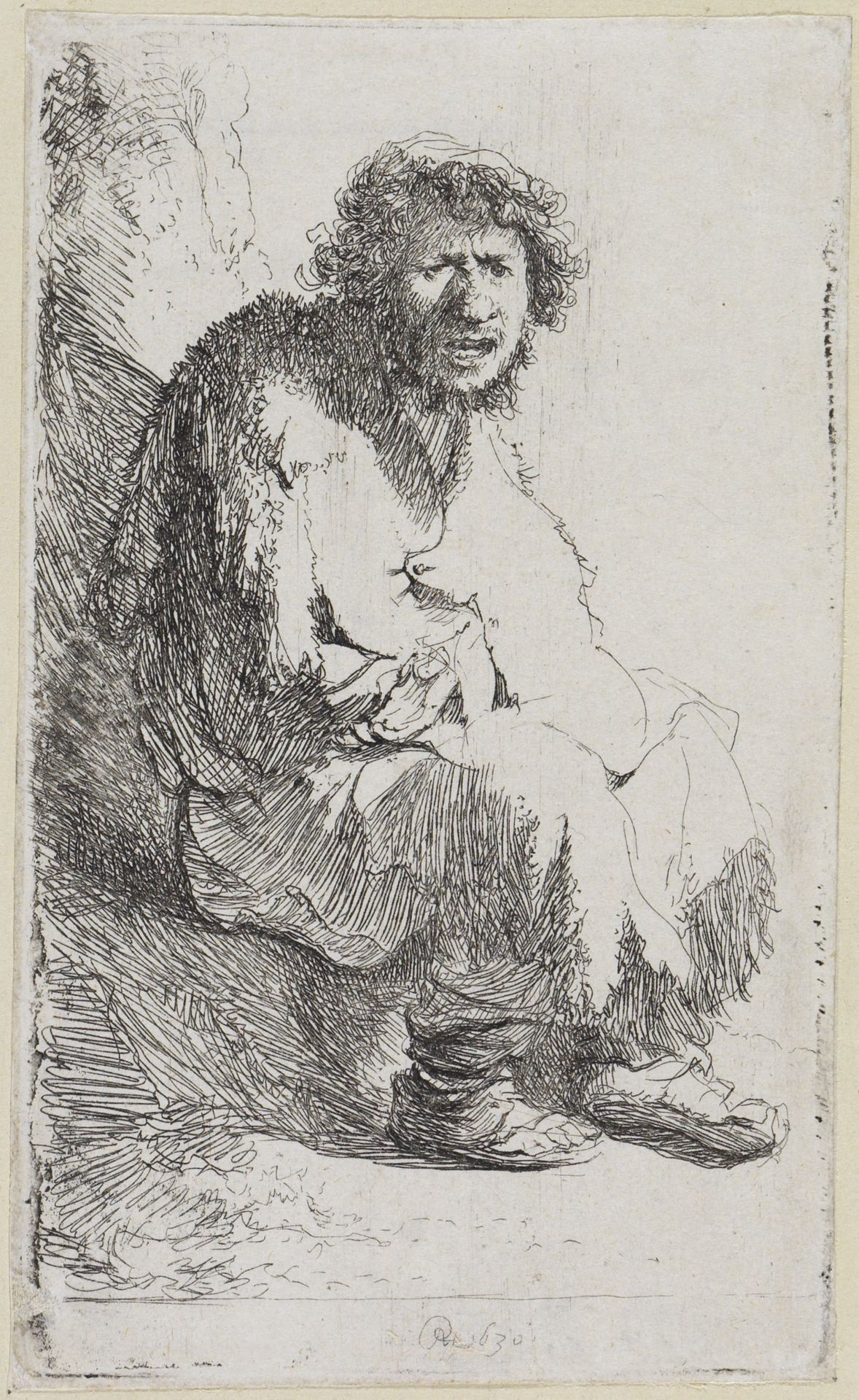 | Titel | Auf einem Erdhügel sitzender Bettler |
