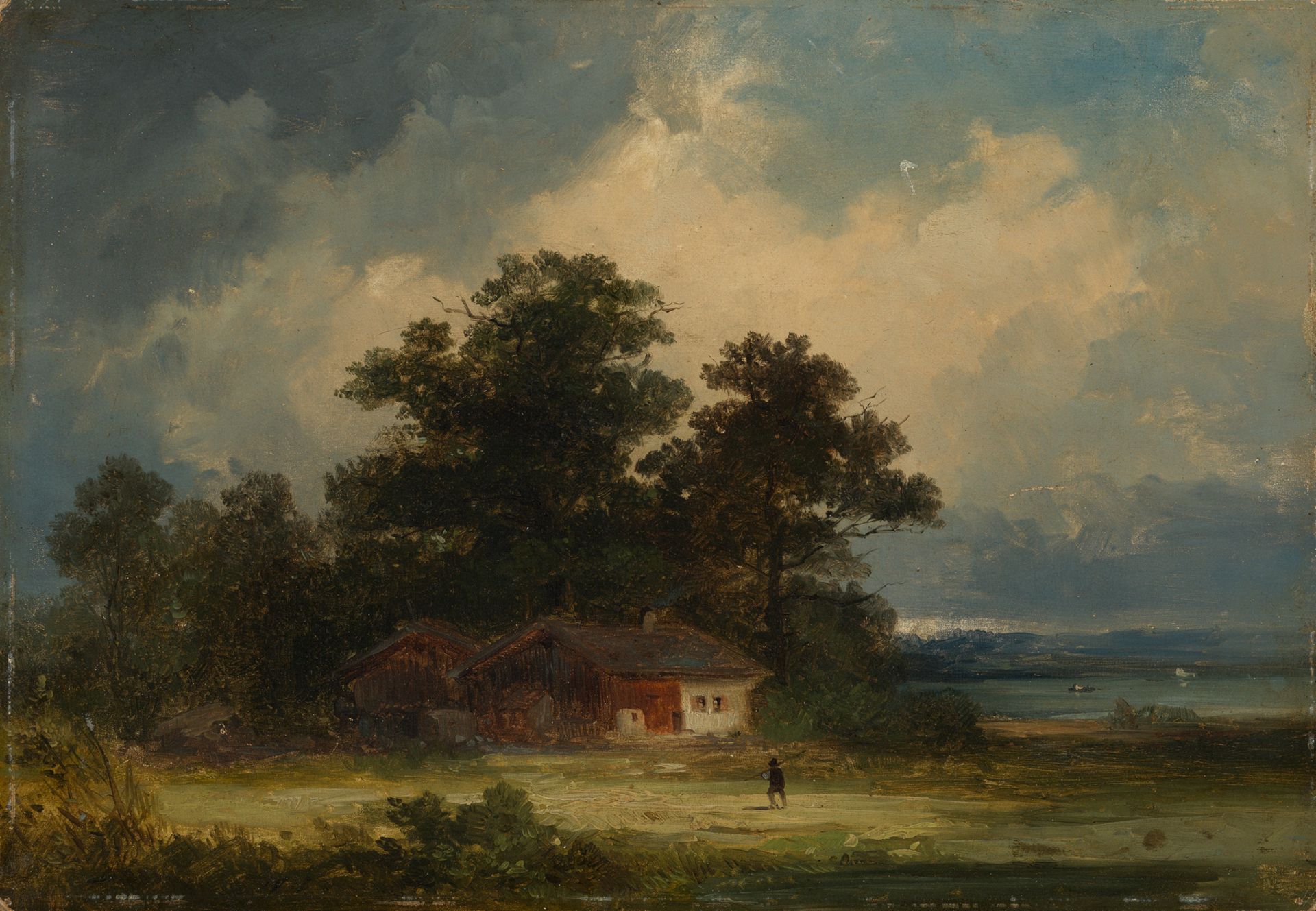 | Titel | Bauernhaus unter Bäumen an einem bayerischem See |